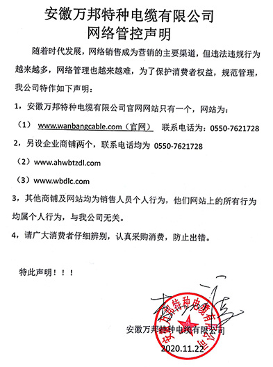 鄭重聲明:安徽萬邦特種電纜有限公司官方網站為:www_wanbangcable_com.mnctm837.cn,除此之外無任何子網站或合作網站,其余均為假冒偽劣。電話:0550-7621728 13485756353 地 址:安徽省天長市滁州高新技術產業開發區經四路29號